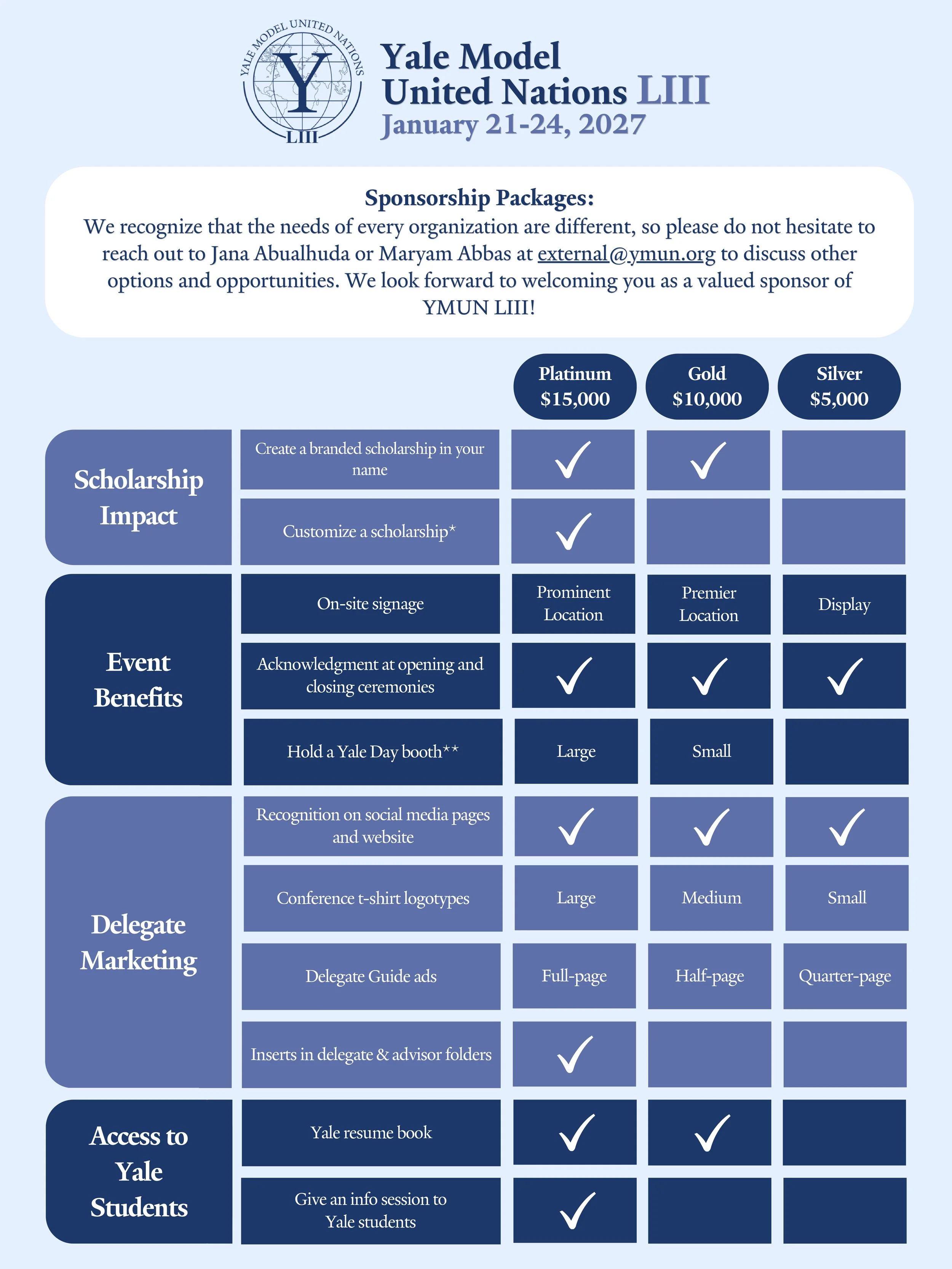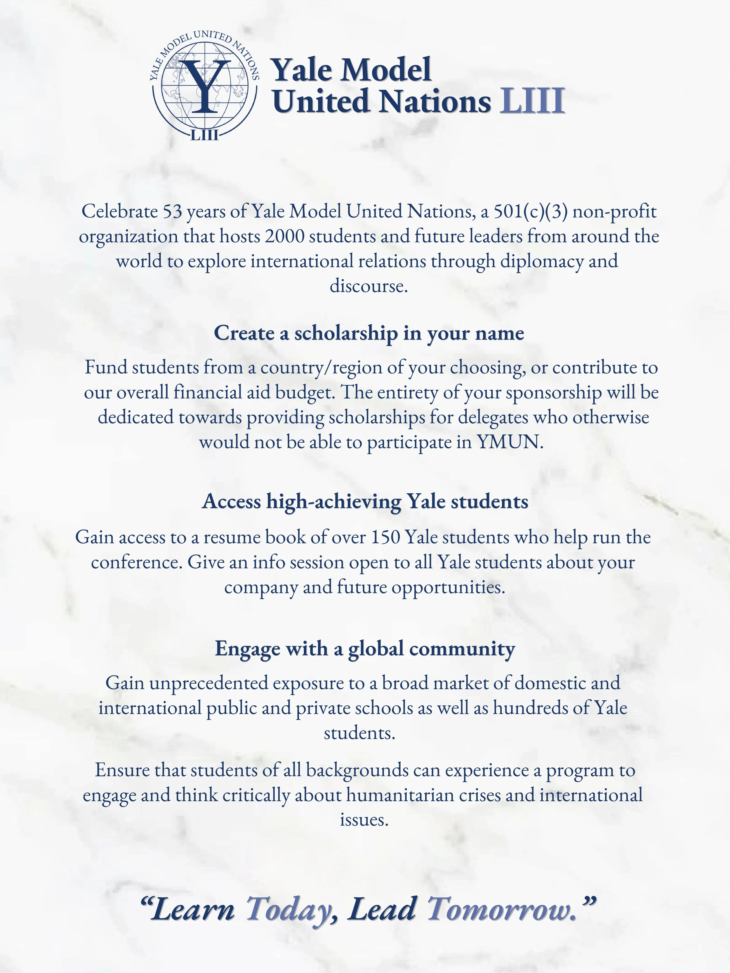 Our generous sponsors enable Yale Model United Nations to provide world-class educational programming to delegates from around the world.